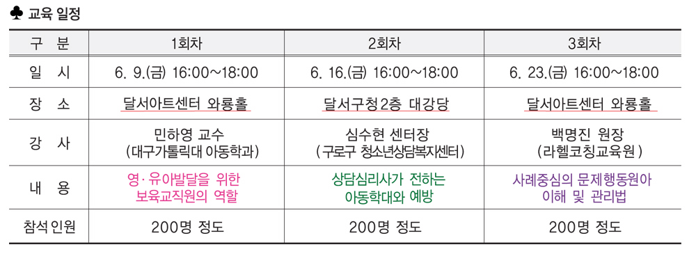 교육은 16일(금) 구청 2층 대강당에서 ‘상담심리사가 전하는 아동학대와 예방’, 23일(금) 달서아트센터에서 ‘사례중심의 문제행동원아 이해 및 관리법’ 이 예정돼 있다.