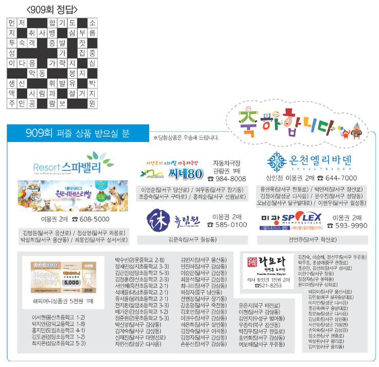 ♣ ‘가족과 함께 풀어보세요’정답을 아시는 분은 본사 편집부로 보내주시기 바랍니다. 2월 19일까지 도착된 엽서 중에서 추첨을 통해 상품을 드립니다. 주소를 정확히 기재해 주십시오. 당첨상품을 우송해 드립니다.