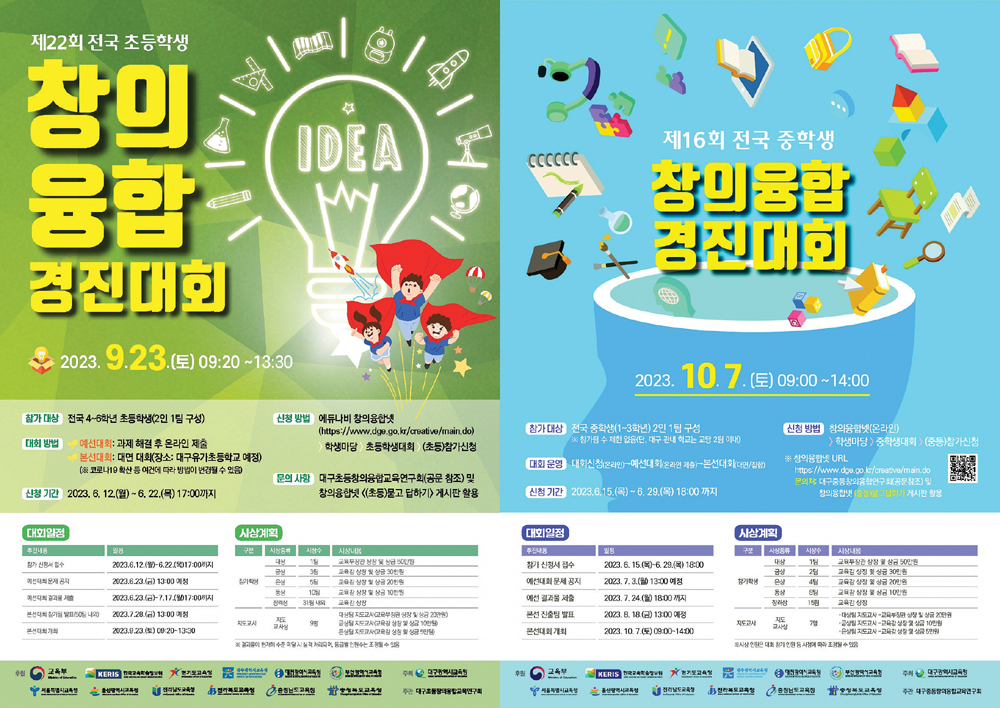 대구시교육청(교육감 강은희)은 창의적 사고력과 문제해결능력을 키울 수 있는 기회를 제공하고, 창의력이 우수한 학생들을 조기에 발굴하기 위해 전국 초·중학생 창의융합경진대회를 개최한다.