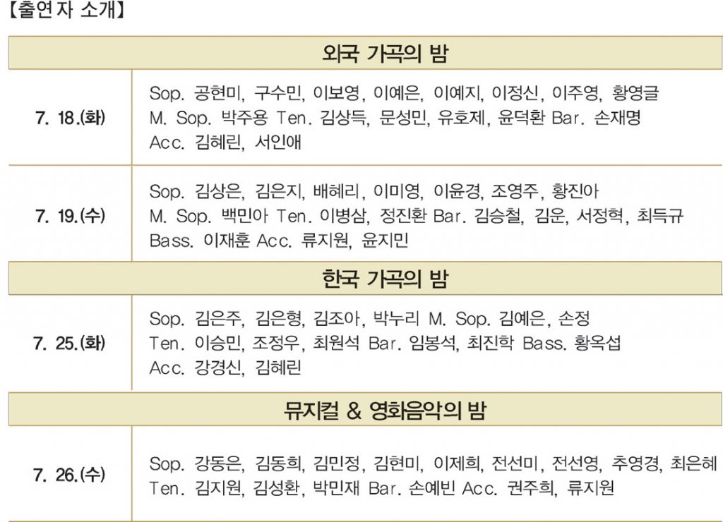 지난 4일과 5일에는 한국 가곡의 밤이라는 주제로 성악가 25명이 출연해 우리 가곡만이 가진 특유의 정서와 아름다운 선율의 세계로 관객들을 안내했으며, 지난 11일과 12일에는 28명의 성악가가 출연해 오페라 중창의 밤을 주제로 음악회를 열었다. 도니체티 오페라 ‘사랑의 묘약’, 베르디의 오페라 ‘라 트라비아타’, ‘운명의 힘’, ‘일 트로바토레’, ‘리골레토’, 모차르트 오페라 ‘마술피리’ 등 오페라 작곡가 8명의 작품 속 중창을 연주했다.