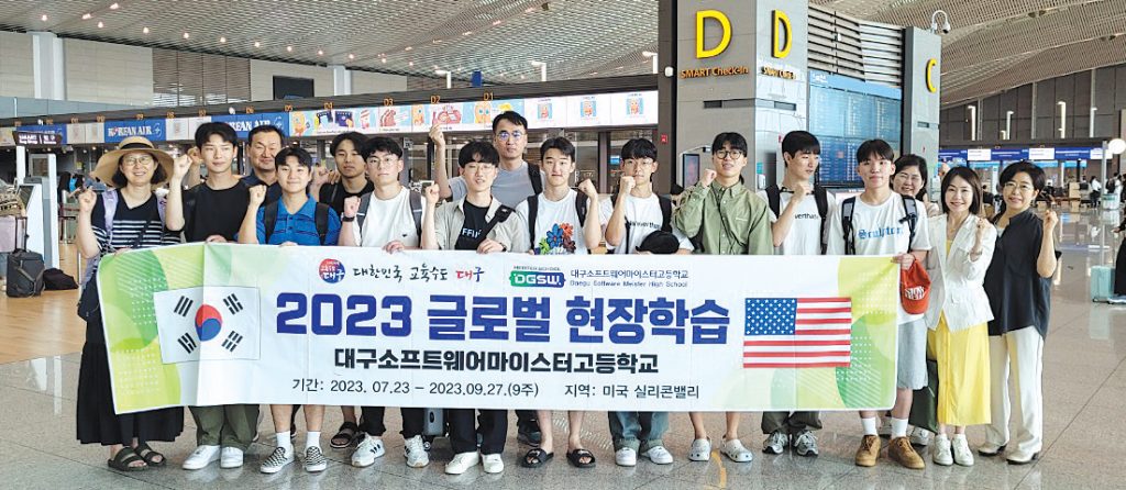 대구소프트웨어마이스터고등학교(교장 박유현, 이하 대구SW마이스터고)는 3학년 학생 10명이 2023학년도 글로벌 현장학습을 위해 7월 23일(일)~9월 27일(수) 9주간의 일정으로 미국 실리콘밸리 현지 기업에서 근무를 실시한다. ‘2023학년도 글로벌 현장학습’은 대구시교육청이 글로벌 기술인재 양성을 위해 해외로 학생을 파견하는 사업으로, 개교 이래 꾸준히 해당 사업에 참여해온 대구SW마이스터고는 올해도 운영학교로 선정되어 3학년 학생 10명을 IT산업의 메카인 실리콘밸리로 파견하게 됐다.