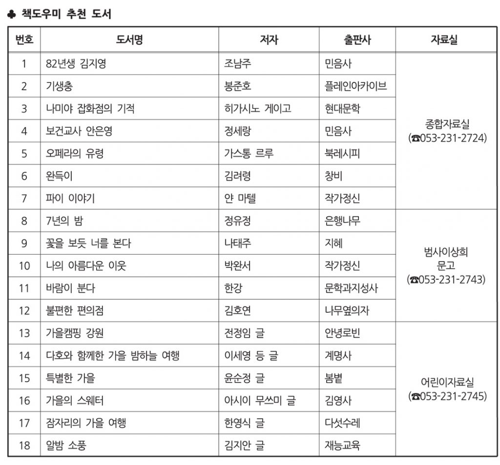 기타 자세한 사항과 도서 목록은 두류도서관 홈페이지(library.daegu.go.kr/duryu)를 참고하거나 해당 자료실(☎231-2724, 2743, 2745)로 문의하면 된다.