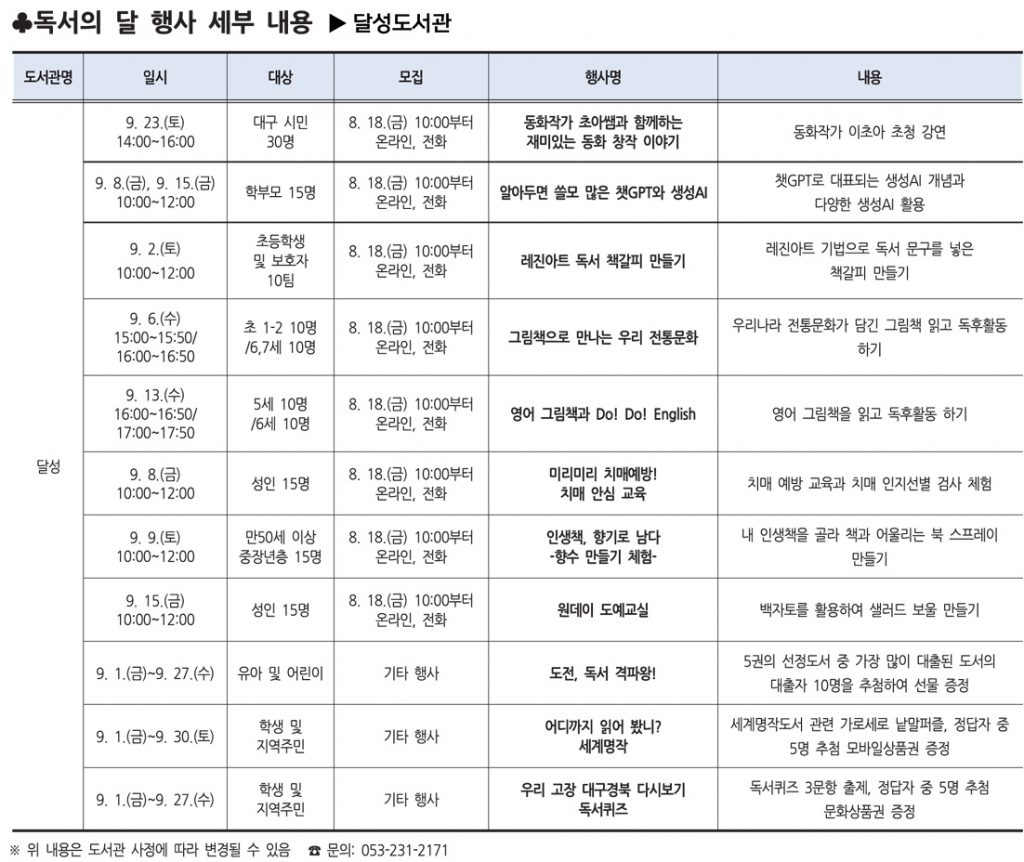 ▶달성도서관(관장 이형주)은 동화작가 이초아 초청 강연 ‘동화작가 초아쌤과 함께하는 재미있는 동화 창작 이야기’, 학부모를 대상으로 하는 챗GPT 강연 ‘알아두면 쓸모 많은 챗GPT와 생성AI’, 치매 예방 교육과 치매 인지 선별 검사를 체험할 수 있는 ‘미리미리 치매예방! 치매 안심 교육’ 등의 행사를 운영한다.(문의: 독서문화실 ☎231-2171)