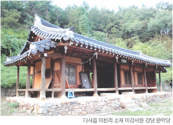 이강서원은 서사원 사후 24년 뒤인 1639년, 그의 생전 강학소였던 이천정사 터에 세워진 서원이다. 처음의 이강서원은 강당·사우·고직사 등을 모두 갖췄다. 하지만 1868년(고종 5) 흥선대원군의 서원철폐령으로 훼철, 지금은 강당인 완락당과 솟을대문인 이락루만 복원된 상태다. 복원된 완락당은 정면 5칸, 측면 1칸 규모의 홑처마 맞배지붕 건물로 전면으로 반 칸 툇간이 있으며, 좌우 양 측면에 부섭지붕을 덧댔다. 완락당이라는 당호는 주자의 자양서원의 예를 취한 것으로 도를 즐기는 즐거움을 뜻한다. 한편 3칸 솟을대문은 가운데 한 칸만 출입문이고 좌우 2칸은 문간방이다. 그런데 이 문에 붙어 있는 편액이 좀 이상하다. 이락문이 아닌 이락루이기 때문이다. 이는 아마도 훼철 이전 서원의 전면에 이락루라는 누문이 있었다는 뜻인 것 같다. 또 다른 의문은 ‘이락루[二樂樓·즐거울 락]’인지 아니면 ‘이요루[二樂樓·좋아할 요]’인지 하는 의문이다. 미락재·낙재·완락당 등을 참고하면 이락루인 것 같은데, 논어에 나오는 ‘인자요수 지자요산’을 고려하면 이요루일 것 같기 때문이다.