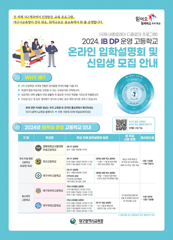 대구시교육청(교육감 강은희)은 학생, 학부모 등에게 IB 운영 고등학교 교육과정, 입학전형 등의 정보를 제공하기 위해 ‘2024학년도 국제 바칼로레아(IB) 운영 고등학교 온라인 공동 입학설명회’를 운영한다.