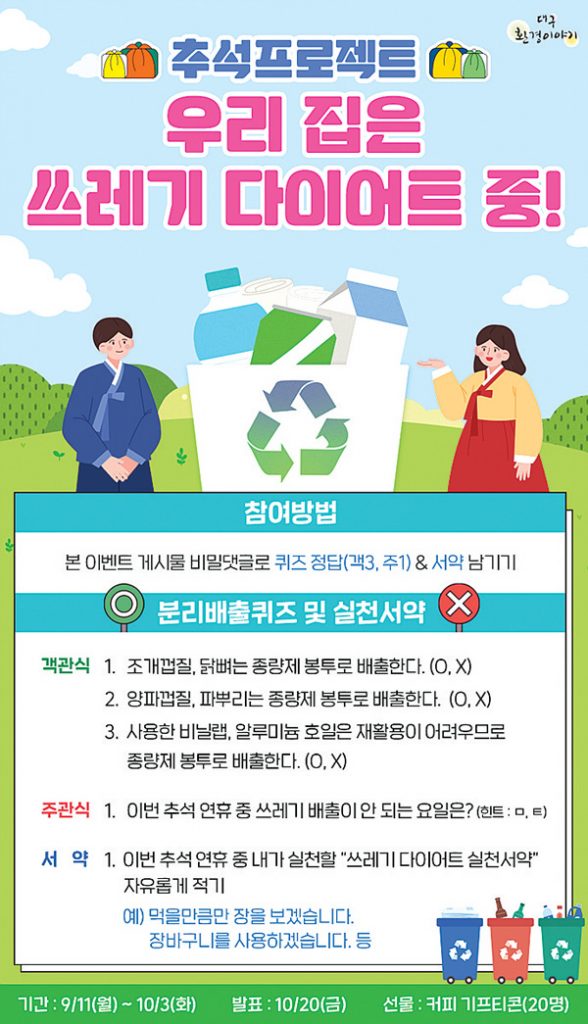 ? 추석프로젝트, 우리 집은 쓰레기 다이어트 중! 이벤트 ▶(기간 / 대상) ’23. 9. 11.∼10. 3. / 대구시민 모두 ▶(참여방법) 대구환경이야기 블로그에 접속→①퀴즈 풀기(배출요일·분리배출) ②쓰레기 다이어트 실천 서약하기→댓글 남기기 (https://blog.naver.com/ecocitydae