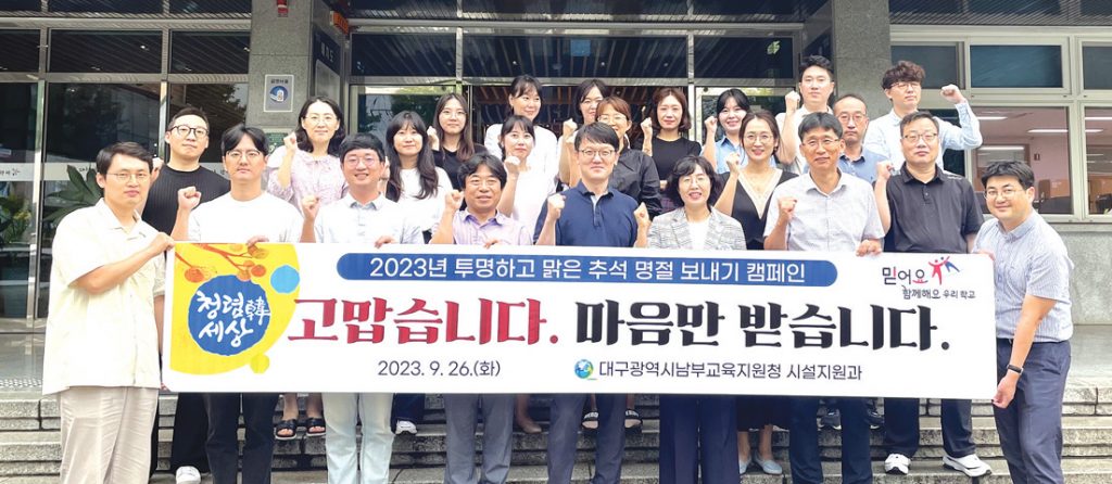 대구남부교육지원청(교육장 김동관)은 지난달 26일(화) 투명하고 맑은 추석 명절을 보내기 위한 청렴 캠페인을 실시하고, 주요 건설공사 현장의 39개의 업체에 협조 안내문을 배포했다.