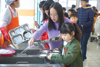 학교사랑 후배사랑 프로젝트의 첫 스타트를 끊었던 입학식에서 자신의 손을 이끌고 입학식장까지 함께 입장했던 6학년들이 학교밥상 짝으로 다시 나타나자 1학년들은 반가움과 기대에 찬 표정으로 환호성을 지르고 6학년들에게 먼저 손을 내밀며 환하게 맞이해주었다. 식당까지 손을 맞잡고 이동하며 6학년들도 동생들에게 그 동안 학교생활이 어땠는지, 학교밥상은 맛있는지 등 이것저것 관심을 보이며 후배를 사랑하는 마음을 숨기지 않았다.