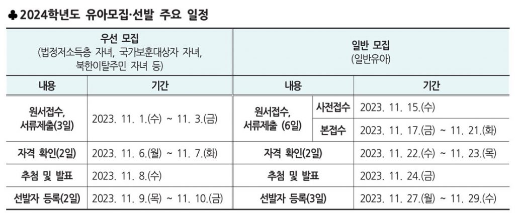 ▲우선모집은 법정저소득층 가정의 유아, 기타 유치원장이 정한 유아 등을 대상으로 11월 3일(금)까지 3일간 진행되며 8일(수) 결과를 발표한다.