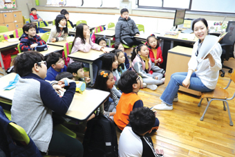 11일 목요일 1·2학년 교실에서 실시된 리딩맘들의 책읽어주기 활동에는 교장 선생님도 참여하였다. 오고가는 질문과 대답 속에서 단지 책 안의 텍스트에 갇힌 이야기가 아니라 학생과 학부모, 선생님이 함께 만들어가는 이야기가 완성했다.