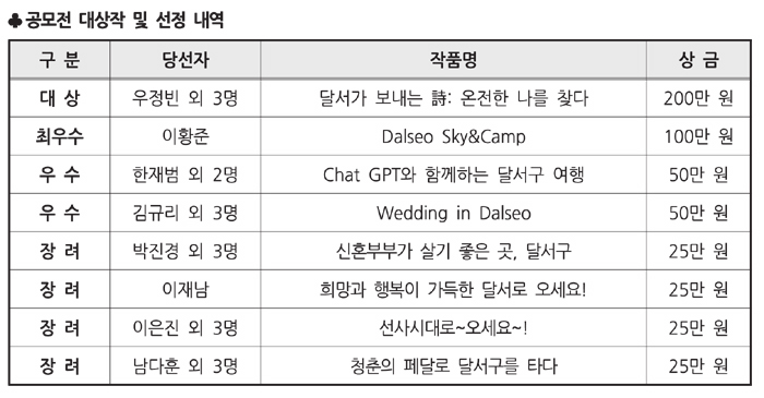 대상은 달서구의 아름다움을 감성적인 글귀와 함께 영상에 담아, 마치 한 편의 시를 건네는 듯한 작품 ‘달서가 보내는 詩: 온전한 나를 찾다’에 돌아갔으며, 심사위원들로부터 창의성과 작품성이 돋보인다는 평가를 받았다.