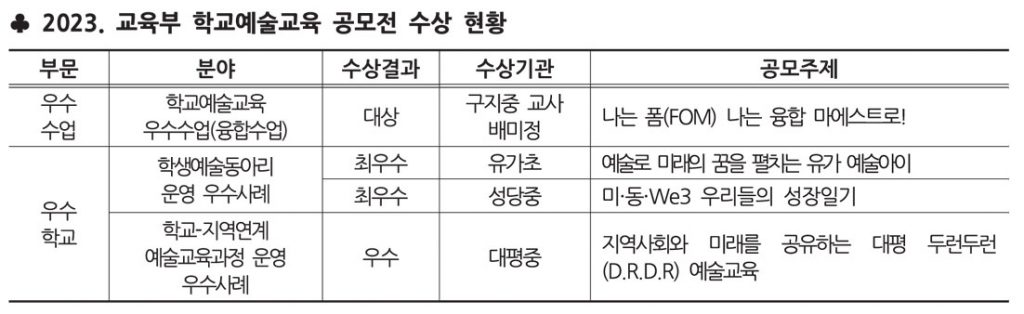 대구시교육청은 ▲우수수업 부문 중 ‘타 교과 융합수업’ 분야에서 구지중 배미정 교사가 대상을, ▲우수학교 부문 중 ‘학생예술동아리 운영 우수사례’ 분야에서 유가초, 성당중이 최우수상을, ▲우수학교 부문 중 ‘학교-지역연계 예술교육과정 운영 우수사례’ 분야에서 대평중이 우수상을 각각 수상했다.