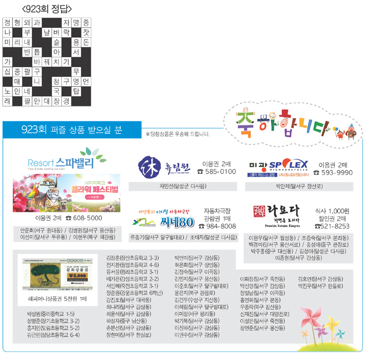 ♣ ‘가족과 함께 풀어보세요’정답을 아시는 분은 본사 편집부로 보내주시기 바랍니다. 5월 28일까지 도착된 엽서 중에서 추첨을 통해 상품을 드립니다. 주소를 정확히 기재해 주십시오. 당첨상품을 우송해 드립니다.