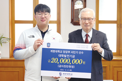 계명대 양궁부 서민기(남·22·체육학전공 4) 선수가 지난 20일(수) 모교인 계명대에 발전기금으로 2,000만 원을 전달했다.