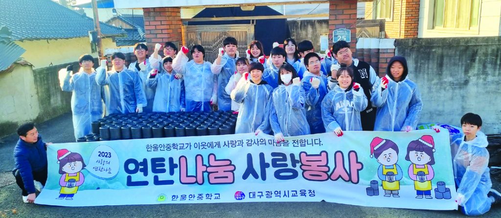 한울안중학교(교장 윤재철)는 학생과 교직원 50명이 지난해 12월 27일(목) 학교 인근 현풍 및 구지 지역 소외계층에 연탄 1,000장과 쌀을 전달했다. 학생들은 축제와 경제공동체 활동을 통한 성금으로 이웃에게 사랑과 감사의 마음을 전달하기 위해 달성연탄은행에서 두 가정을 추천받아 함께 사랑의 연탄을 전달했다.<자료제공:한울안중학교>