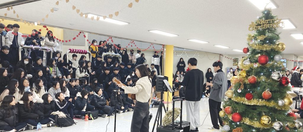 유가중학교(교장 안상희)는 지난해 12월 22일(금) 전교생을 대상으로 학생주도 또래활동을 통한 학생간·사제간 긍정적 관계형성을 돕고 행복한 학교 문화 조성을 위해 ‘캐롤이 흐르는 여기는 유가월드’ 행복 더하기 행사를 실시했다. 이번 행사는 유가중 학생자치회와 밴드부 학생들이 협력해 ‘캐롤 버스킹’ 공연을 실시하고 전교생들에게 작은 선물을 나누며 기쁨을 더했다. <자료제공:유가중학교>