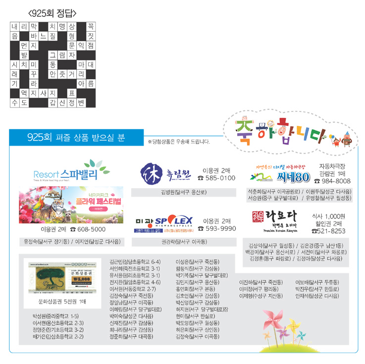 ◑ ‘가족과 함께 풀어보세요’ 낱말퍼즐을 만들어 푸른신문으로 보내주세요. 채택된 분께는 작은 선물을 우송해 드립니다.