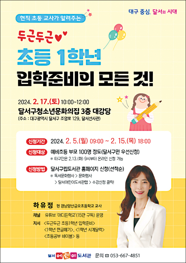 예비초등 부모특강은 2월 17일(토) 오전 10~12시 달서구청소년문화의집에서 하유정 강사를 초청해 ‘두근두근 초등 1학년 입학 준비의 모든 것!’ 주제로 강연한다.