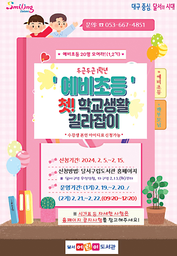예비초등 프로그램 1기는 2월 19(월)~20일(화) 오전 9시 20분~오후 12시 20분, 2기는 2월 21(수)~22일(목) 오전 9시 20분~오후 12시 20분으로 나눠 달서어린이도서관에서 학교생활 예행연습 프로그램을 운영한다.