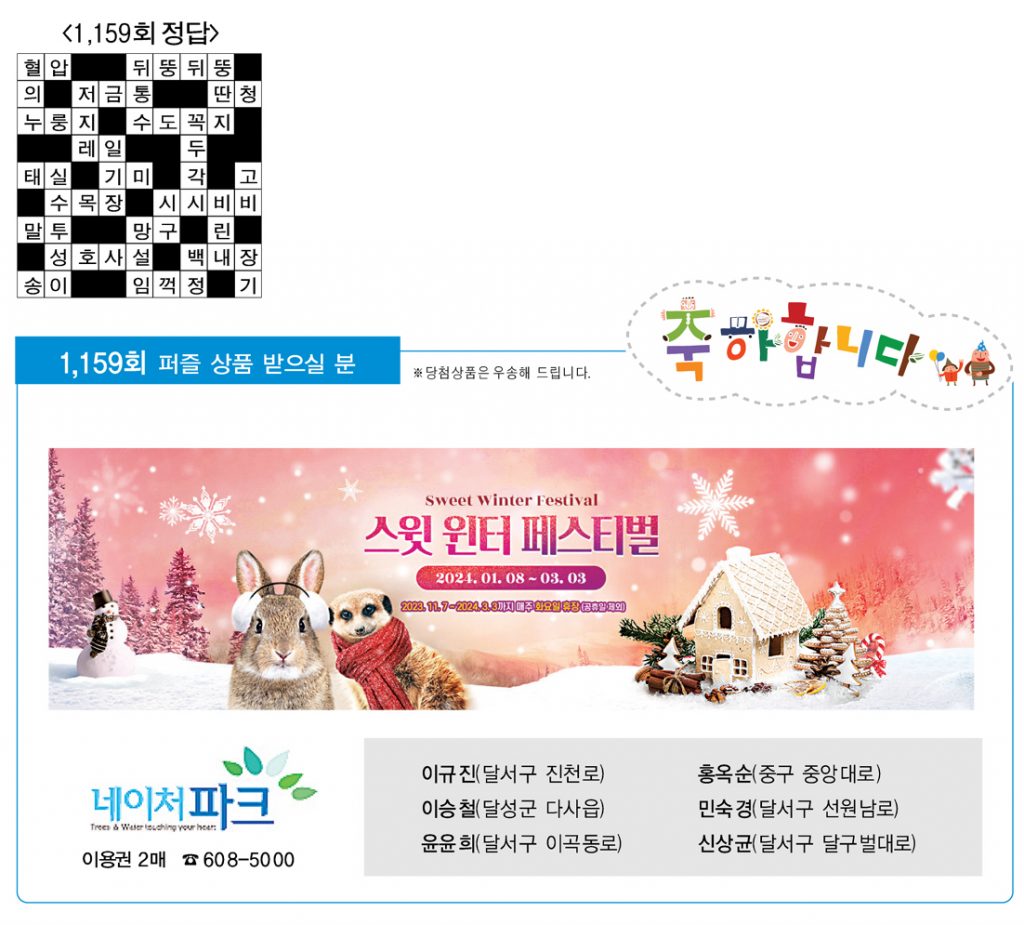 ◑ 제1,161회 ‘가족과 함께 풀어보세요’는 달성군 다사읍 다사로71 박재훈 독자께서 출제해 주셨습니다. 출제해 주신 분께는 작은 선물을 우송해 드립니다.