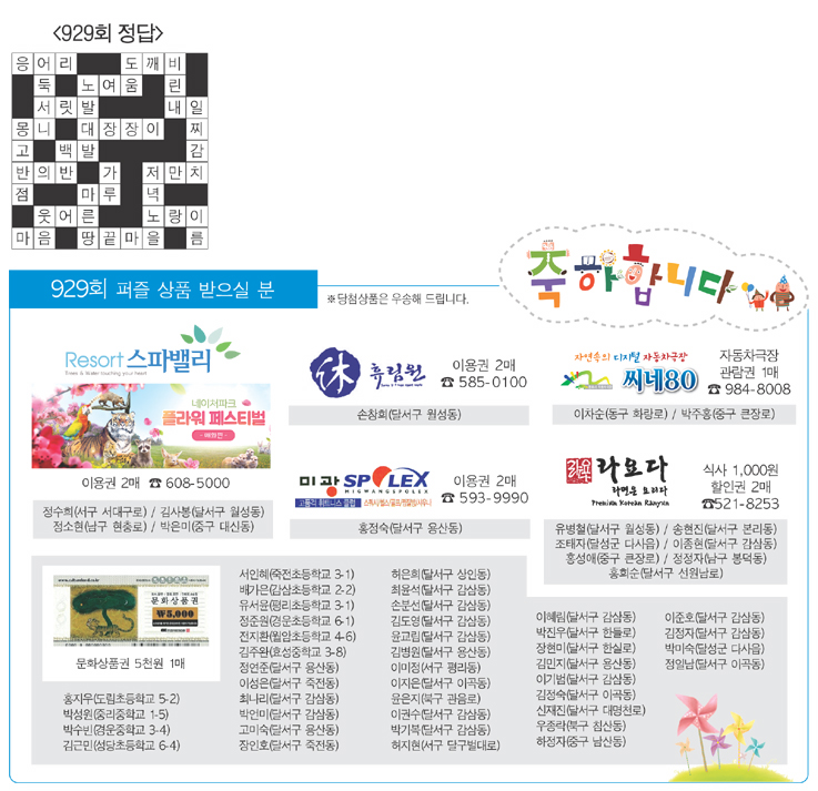 ♣ ‘가족과 함께 풀어보세요’정답을 아시는 분은 본사 편집부로 보내주시기 바랍니다. 7월 2일까지 도착된 엽서 중에서 추첨을 통해 상품을 드립니다. 주소를 정확히 기재해 주십시오. 당첨상품을 우송해 드립니다.