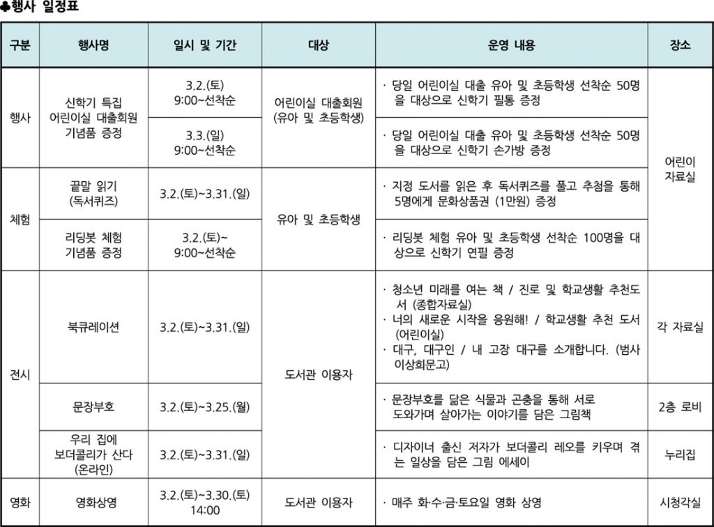 대구두류도서관(관장 주해숙)은 3월 새학기를 맞아 학생 및 지역주민을 위한 다양한 체험, 전시 행사를 운영한다.