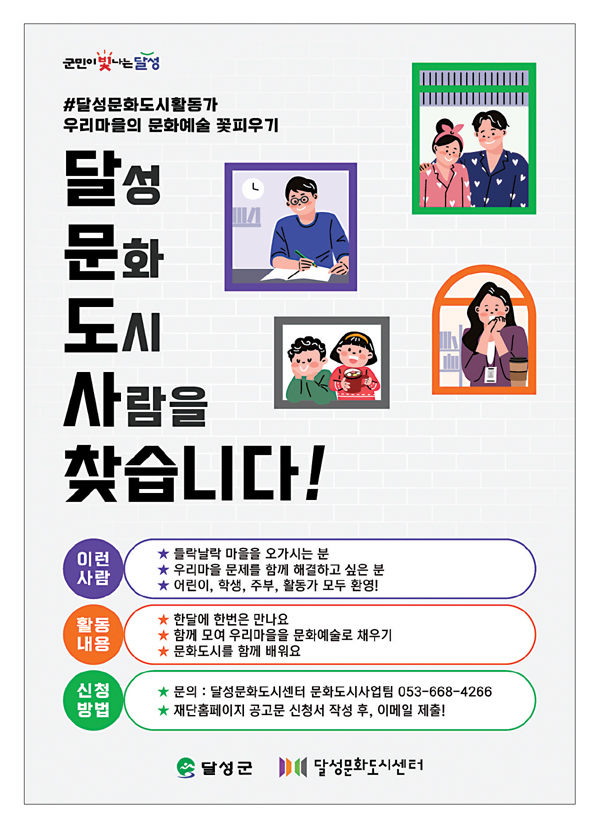 (재)달성문화재단(이사장 최재훈) 달성문화도시센터는 3월 31일(일)까지 권역 문화활동가 ‘달성문화도시사람들’을 모집한다.