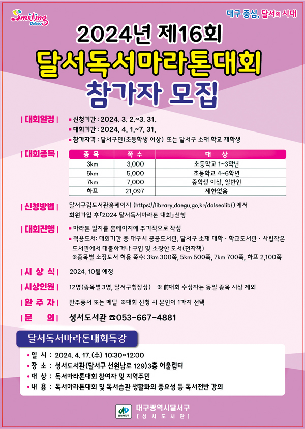 달서구(구청장 이태훈)가 3월 31일(일)까지 독서습관 형성의 기회를 마련하고 책 읽는 분위기 확산을 위해 ‘제16회 달서독서마라톤 대회’ 참가자를 모집한다.