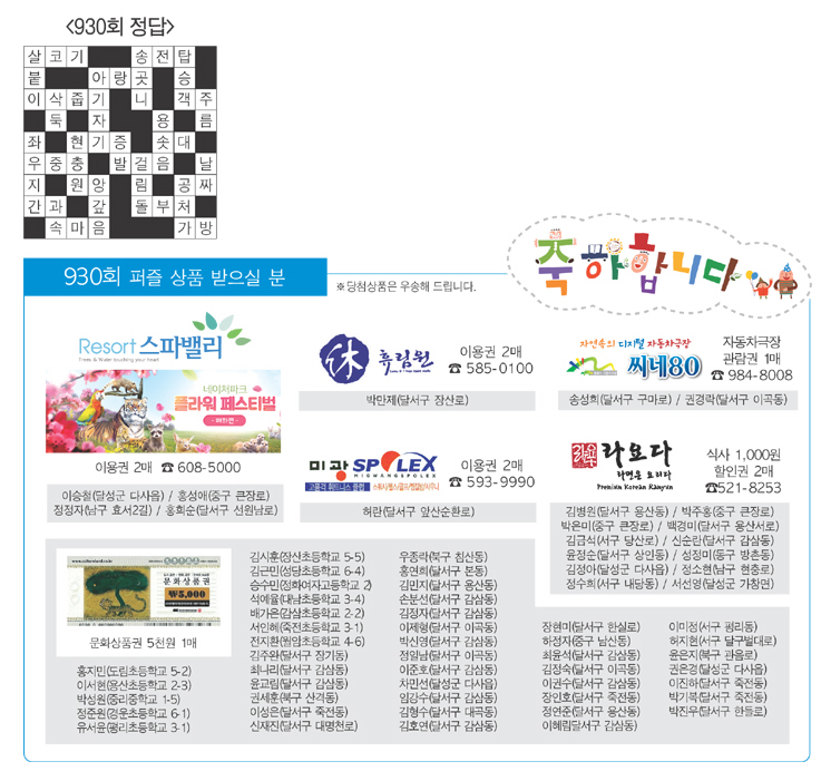 ◑ ‘가족과 함께 풀어보세요’ 낱말퍼즐을 만들어 푸른신문으로 보내주세요. 채택된 분께는 작은 선물을 우송해 드립니다.