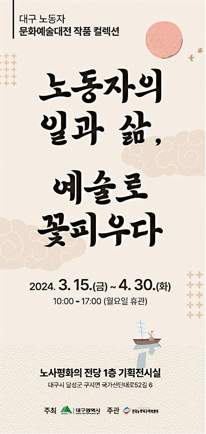 대구광역시는 노사상생 프로그램 운영사업 일환으로 ‘노동자의 일과 삶, 예술로 꽃피우다’라는 주제로 대구노동자 문화예술대전 수상작품 45점 전시회를 4월 30일(화)까지 노사평화의 전당에서 개최한다. 노사평화의 전당은 주말에도 정상 운영(매주 월요일 휴관)하며, 시민 누구나 무료로 체험·관람(10:00~18:00)이 가능하다.