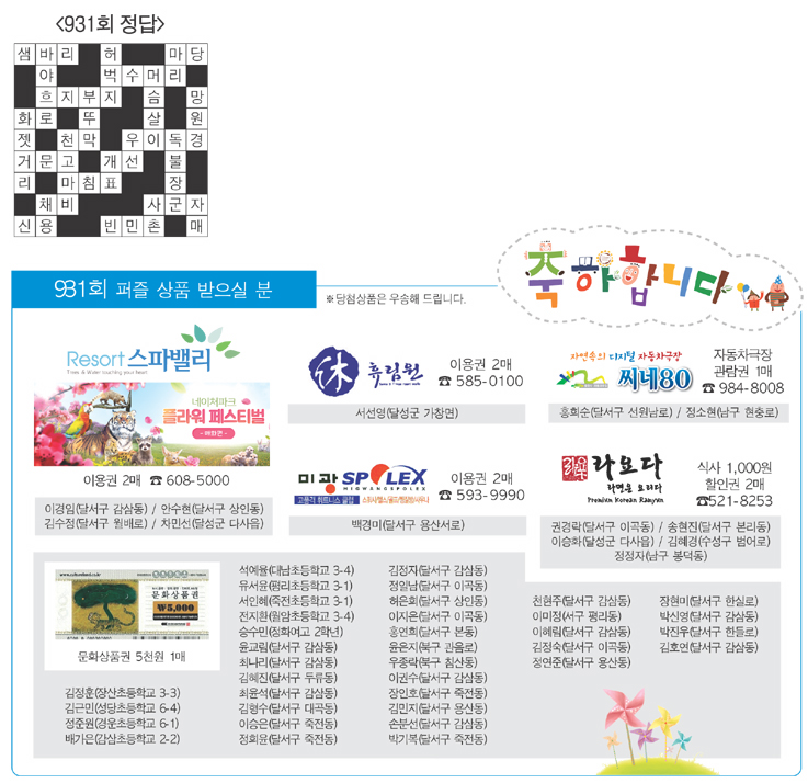 ◑ ‘가족과 함께 풀어보세요’ 낱말퍼즐을 만들어 푸른신문으로 보내주세요. 채택된 분께는 작은 선물을 우송해 드립니다.