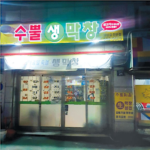 막창·삼겹살 체인점도 많이 생겼지만, 노포 감성을 느끼고 싶다면, 성서계대 농협 맞은편 골목으로 들어오면 편의점 바로 옆에 위치한 ‘수뿔생막창’이 제격이다.