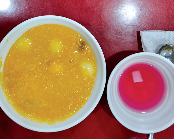 호박죽을 주문하고 자리에 앉으니, 새알이 든 노란 호박죽이 무 동치미와 함께 나온다.