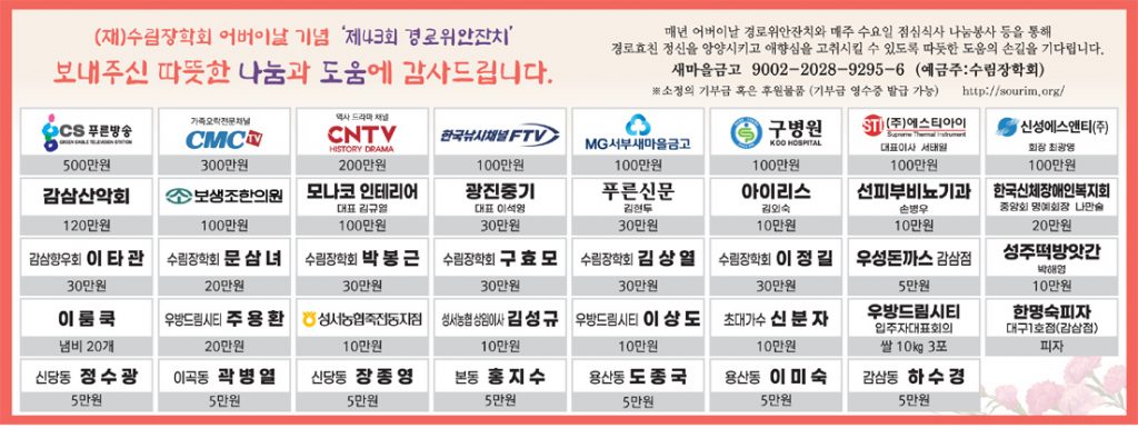 지역의 어르신들과 청소년들의 애향심을 고취할 수 있도록 지역민들이 도와주신다면, 우리 지역의 온기는 세대를 이어 계속 전달될 것이다. 수림장학회에서는 소정의 기부금 혹은 후원 물품 등 여러분의 따뜻한 도움의 손길을 기다린다.