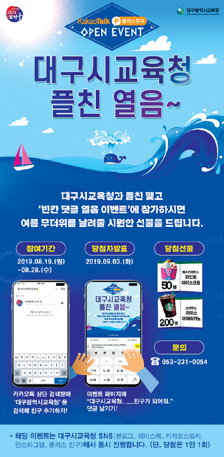 시교육청은 ‘카카오톡 플러스친구 오픈 이벤트’로 이번 달 19일부터 28일까지 열흘간 대구광역시교육청을 카카오톡 플러스친구로 추가하고, 이벤트 페이지에 댓글을 남기면 추첨을 통해 250명(블로그 등 5개 채널별 50명씩)에게 기프티콘을 제공한다.
