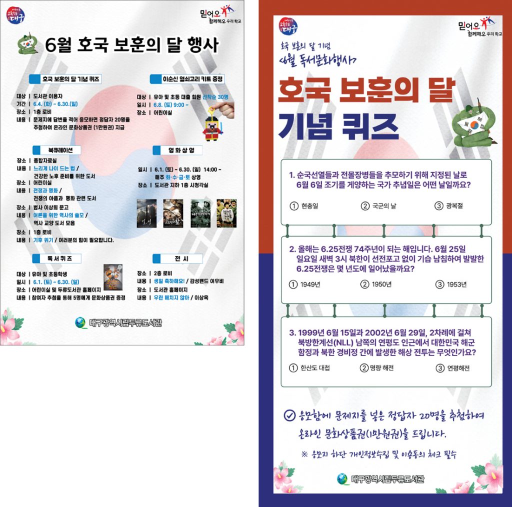 대구두류도서관(관장 주해숙)은 6월 호국 보훈의 달을 맞아 학생 및 지역주민을 위한 다양한 체험, 전시 행사를 운영한다.