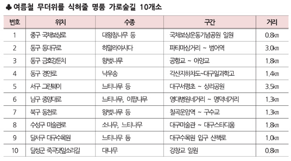 무더운 여름철을 맞아 시원한 나무 그늘 아래에서 가족, 친구들과 함께 산책할 수 있는 대구의 명품 가로숲길 10개 노선을 소개한다.