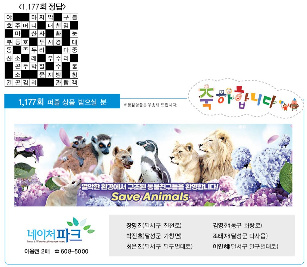 ♣ ‘가족과 함께 풀어보세요’정답을 아시는 분은 본사 편집부로 보내주시기 바랍니다. 7월 16일(화)까지 도착된 엽서 중에서 추첨을 통해 상품을 드립니다. 주소를 정확히 기재해 주십시오. 당첨상품을 우송해 드립니다.
