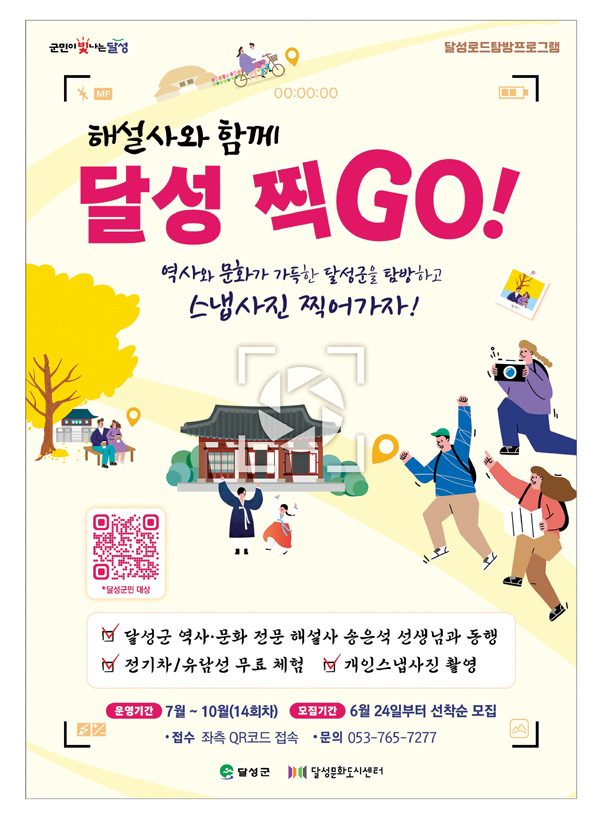 달성문화재단(이사장 최재훈) 달성문화도시센터는 지역문화 맞춤형 달성로드탐방 프로그램 ‘달성 찍GO!’를 7~10월까지 지역민을 대상으로 운영할 예정이다.