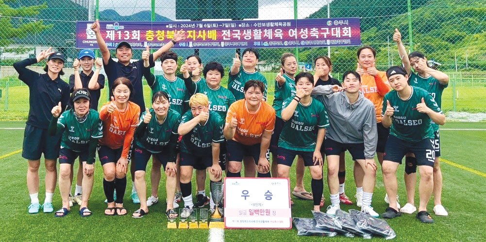 달서구청 여성축구단(단장 최경애)은 지난 6일(토), 7일(일) 양일간 충주시 수안보생활체육공원에서 열린 ‘제13회 충청북도지사배 전국생활체육 여성축구대회’에 출전해 우승했다. 이번 대회는 충청북도체육회와 충청북도축구협회가 주최하고 충청북도축구협회와 충주시축구협회가 주관한 이번 대회에서 달서구청 여성축구단은 상금 100만 원을 받았으며, 성가을 선수가 최우수선수상, 류채민 선수가 공격상, 김선자 선수가 골키퍼상, 안현찬 코치가 최우수지도자상을 수상했다.