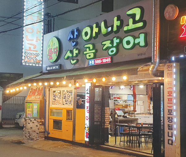 오늘 찾은 ‘원조 왔다 산아나고, 산곰장어’ 위치는 우체국에서 구병원 쪽으로 50m 정도만 가면 된다. 왼쪽에 자리 잡고 있으며, 30년 이상 이곳에서 영업하는 소문난 맛집이기도 하다.