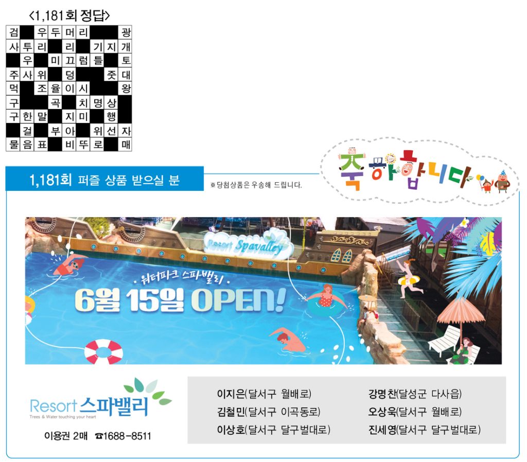 ◑ 제1,182회 ‘가족과 함께 풀어보세요’는 달성군 다사읍 다사로71 박재훈 독자께서 출제해 주셨습니다. 출제해 주신 분께는 작은 선물을 우송해 드립니다.