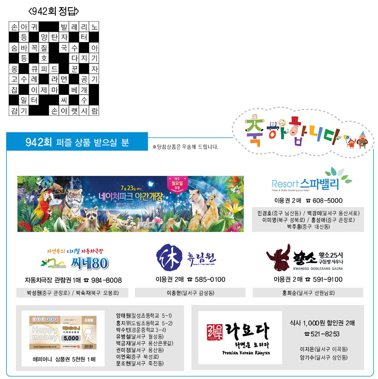 ♣ ‘가족과 함께 풀어보세요’정답을 아시는 분은 본사 편집부로 보내주시기 바랍니다. 10월 22일까지 도착된 엽서 중에서 추첨을 통해 상품을 드립니다. 주소를 정확히 기재해 주십시오. 당첨상품을 우송해 드립니다.