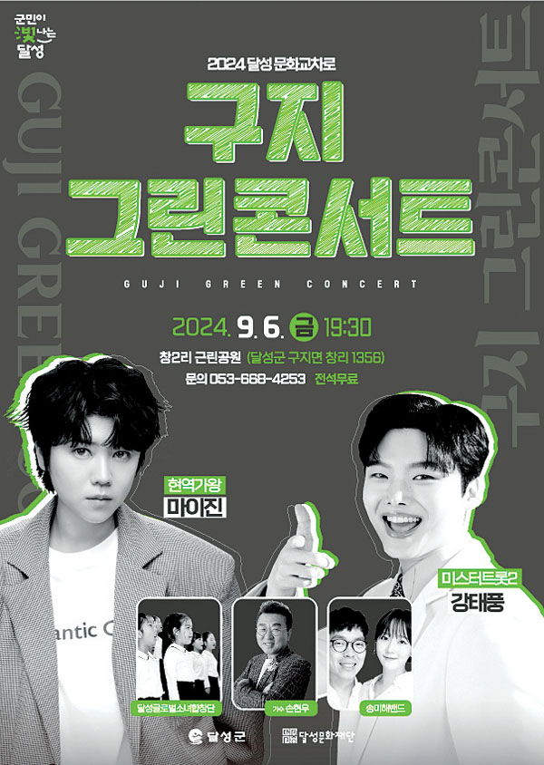 구지 창2리 근린공원(달성군 구지면 창리 1356)에서 마찬가지로 저녁 7시 30분에 개최되는 ‘구지 그린콘서트’는 현역가왕 준우승을 차지하며 새로운 트롯계의 별로 떠오른 가수 마이진, 미스터트롯2 출연 이후 큰 인기를 얻고 있는 가수 강태풍, 대구 인디씬에서 전방위적 활약을 펼치는 보컬 송미해와 기타리스트 정재한으로 이루어진 ‘송미해 밴드’, 지역 출신 가수로 전국을 무대로 활동하는 가수 손현우, 그리고 ‘달성글로벌소녀합창단’이 출연해 관객 밀착형 공연을 선보인다.