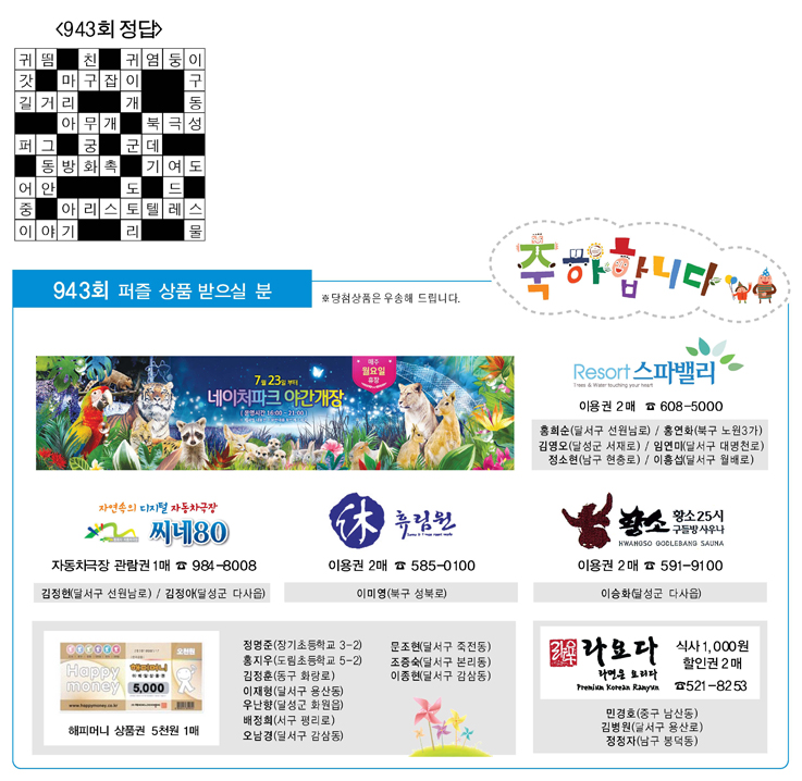 ♣ ‘가족과 함께 풀어보세요’정답을 아시는 분은 본사 편집부로 보내주시기 바랍니다. 10월 29일까지 도착된 엽서 중에서 추첨을 통해 상품을 드립니다. 주소를 정확히 기재해 주십시오. 당첨상품을 우송해 드립니다.