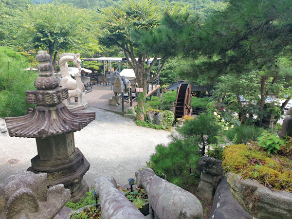 산속에 조성한 ‘카페 담’은 입구 쪽 곳곳에 몇 개의 주차장의 가지고 있다. 가게 들어가기 전에 시원한 계곡 있고 카페 내부와 실외를 동시에 사용할 수 있으며, 가게 입구로 가는 길에는 각각의 크고 작은 조형물들이 야외에 배치되어 있어 또다른 분위기를 조성해 준다.