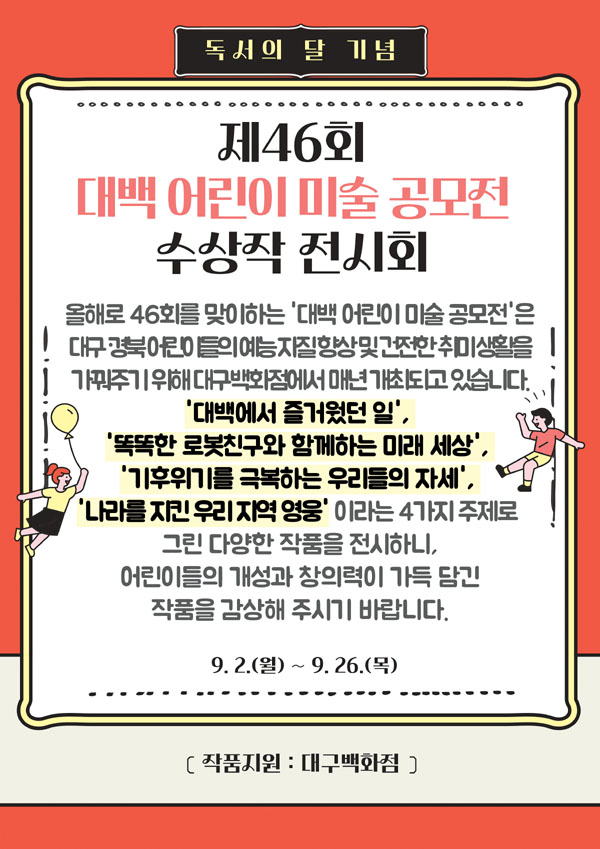 대구달성도서관(관장 정현호)은 오는 9월 26일(목)까지 도서관 1층 로비에서 ‘제46회 대백 어린이 미술 공모전 수상작 전시회’를 개최한다.