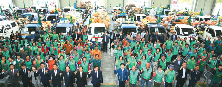 이날 행사에서는 각 읍면별로 일년내내 종류별로 차곡차곡 분리하여 수집한 숨은자원 130여 톤을 화물차량 80여 대로 농산물산지유통센터에 운반 집결시켜 수거실적이 우수한 읍면을 시상하고 있다.