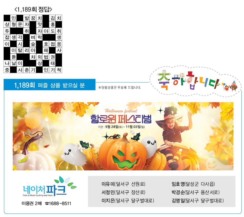 ♣ ‘가족과 함께 풀어보세요’정답을 아시는 분은 본사 편집부로 보내주시기 바랍니다. 10월 22일(화)까지 도착된 엽서 중에서 추첨을 통해 상품을 드립니다. 주소를 정확히 기재해 주십시오. 당첨상품을 우송해 드립니다