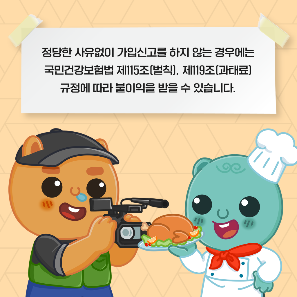 한편, 정당한 사유 없이 신고를 기피하는 경우에는 직권가입 조치 및 국민건강보험법 제115조(벌칙), 제119조(과태료)의 규정에 따라 과태료 부과 등 불이익을 받을 수 있다.